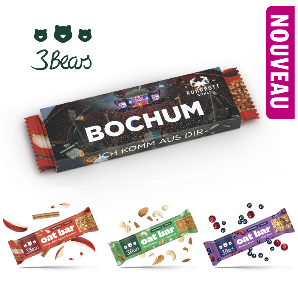 Les délicieuses barres 3Bears sont le snack idéal à tout moment – au bureau, à la crèche ou à la salle de sport, elles se glissent parfaitement dans n’importe quel sac. Disponibles en trois savoureuses variétés qui donnent simplement envie d’en reprendre. Toutes les barres sont véganes, riches en fibres, sans sucre raffiné ni huile de  palme, pour un plaisir responsable et agréable. Conditionnées dans un étui en carton certifié FSC® personnalisable.