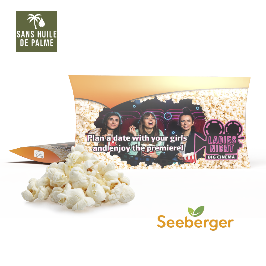 Des grains de maïs à éclater au micro-ondes, croustillants et disponibles en version sucrée ou salée, pour retrouver l’ambiance du cinéma en un rien de temps. Conditionnés dans une boîte en carton personnalisable, ils deviennent un cadeau promotionnel original, alliant parfaitement saveur et visibilité de votre marque.