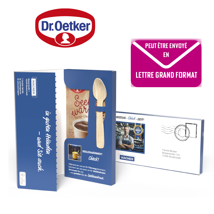 Le pudding instantané en mug de Dr. Oetker séduit par sa saveur gourmande et sa présentation durable. Conditionné dans une chemise d’envoi certifiée FSC®, entièrement personnalisable, il est idéal pour un envoi en lettre grand format. Livré avec une cuillère en bois pratique, il réserve une douce surprise directement dans la boîte aux lettres – parfait pour des campagnes marketing créatives et des cadeaux clients.