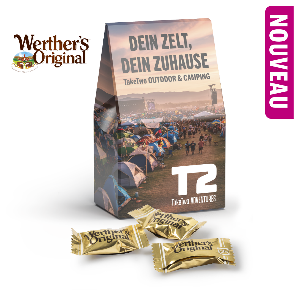 Bonbons caramel fondants et crémeux Werther’s Original, ces classiques appréciés se présentent dans un sachet en carton pratique, autoportant, fabriqué à partir de matériaux certifiés FSC®. L’emballage peut être entièrement personnalisé, offrant un large espace pour mettre en avant votre message de marque. Un cadeau premium qui allie parfaitement goût, durabilité et forte visibilité de la marque.