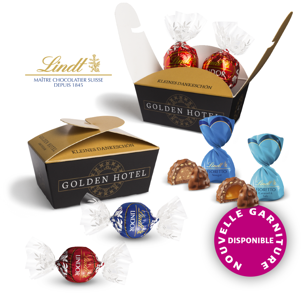 Deux délices exquis de Lindt — soit des truffes Lindt Lindor en chocolat au lait fondant ou en chocolat noir, soit des Lindt Fioretto au nougat ou au caramel & sel — présentés dans un étui promotionnel personnalisé avec fermeture pratique à rabat. Un cadeau promotionnel élégant qui allie parfaitement gourmandise et valorisation de votre marque.